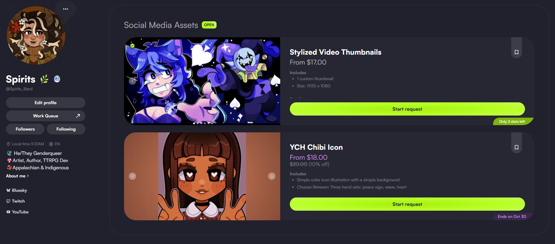 My commissions are open on VGen as well, and Iâll be adding more listings throughout the week. Each new listing will launch with a 25% discount for the first week, both to build portfolio examples and to make them accessible for early supporters.