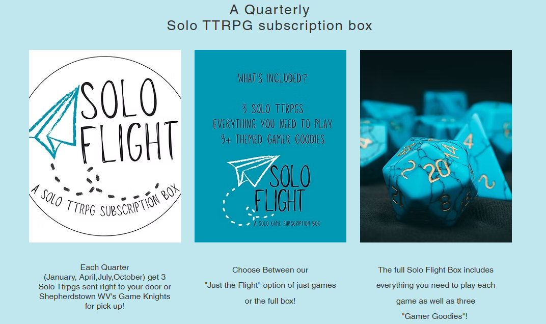 Iām thrilled to announce that Iām working with Solo Flight, a new solo TTRPG quarterly subscription box! Iāll be designing the little goodies that come with each full box. There will be four boxes releasing next year, each featuring amazing indie developers, complete game kits, and some fun extras like pins and stickers.